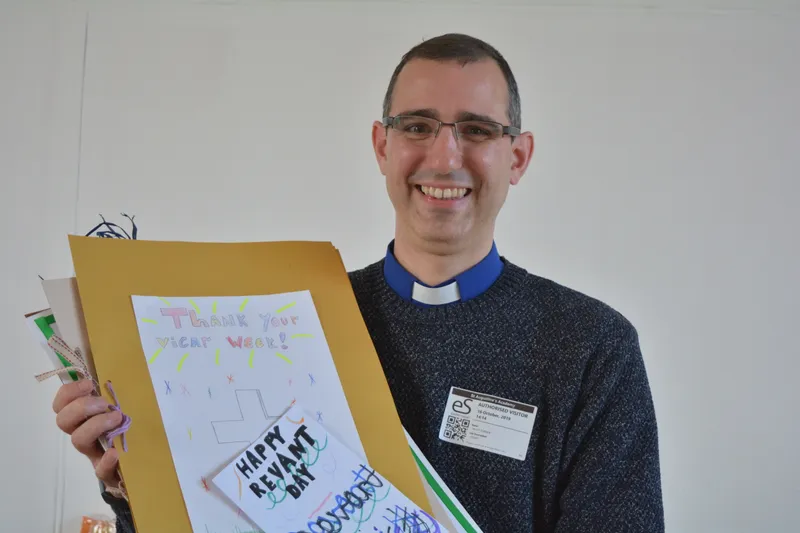 Reverend Ricky enjoying the cards he received from pupils during 'Thank Your Vicar Week'